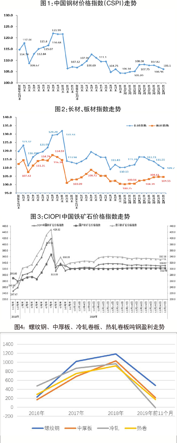 從具體數據(見圖1)來看,2019年初至4月末,鋼材價格受成本面支撐大幅上漲。中國鋼材價格指數(CSPI)于4月29日漲至全年高點,為113.09點。4月末至8月末,國內鋼材市場供大于求的態勢明顯,市場預期回落,鋼材價格由升轉降,中國鋼材價格指數開始回落。8月末至10月末,鋼材價格漲跌互現,并于10月28日跌至全年低點,為104.28點。進入11月份,鋼價又迎來一波反彈行情,中國鋼材價格指數于11月25日漲至108.17點。至12月23日,中國鋼材價格指數回落至106.10點。總體來看,2019年鋼價呈現出“先揚后抑”的特點,期間雖有階段性反彈,但均未超過全年高點。