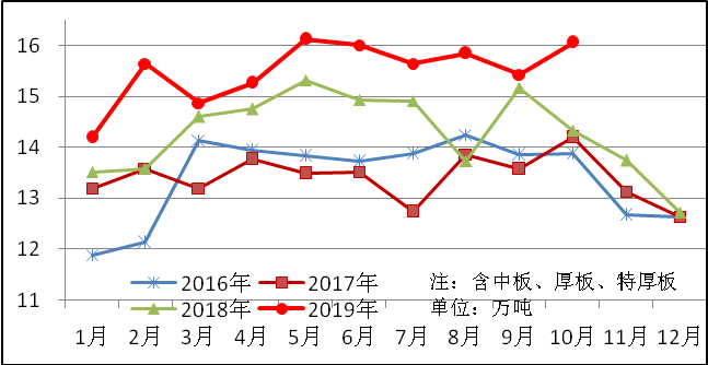 10月份生產特厚板65萬噸,同比增加6萬噸,上升10.5%,銷售64萬噸,其中出口6萬噸,產銷率98.5%;售價4684元/噸,比上月上漲2元/噸;月末庫存40萬噸,比上月增加1萬噸。