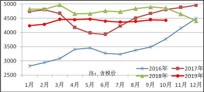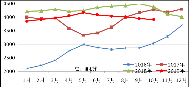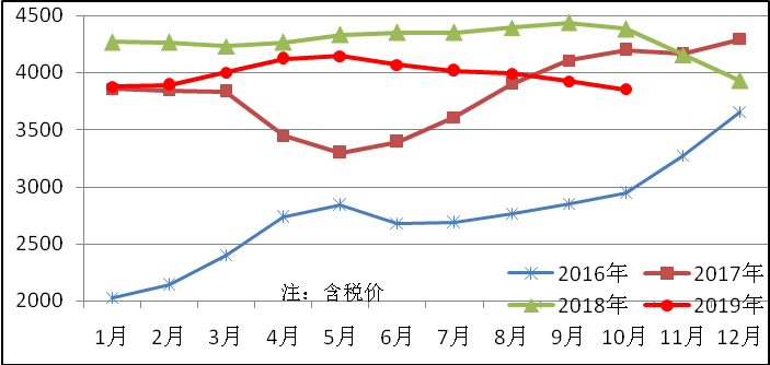 10月份生產中厚寬鋼帶615萬噸,同比增加42萬噸,上升7.3%;銷售611萬噸,其中出口20萬噸,產銷率99.3%;售價3854元/噸,比上月下跌72元/噸;月末庫存106萬噸,比上月增加4萬噸。中厚寬鋼帶平均價格見圖5。