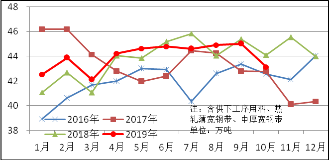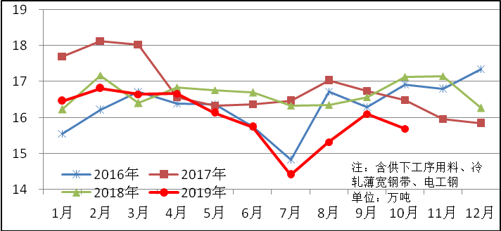 10月份生產鍍錫板10萬噸,與上年同期基本持平;彩涂板11萬噸,同比減少2萬噸,下降12.3%;電工鋼板帶68萬噸,與上年同期基本持平。