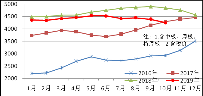 10月份生產中厚板433萬噸,同比增加36萬噸,上升9.13%,銷售415萬噸,其中出口30萬噸,產銷率95.8%;售價4182元/噸,比上月下跌138元/噸;月末庫存176萬噸,比上月增加18萬噸。中厚板平均價格見圖4。