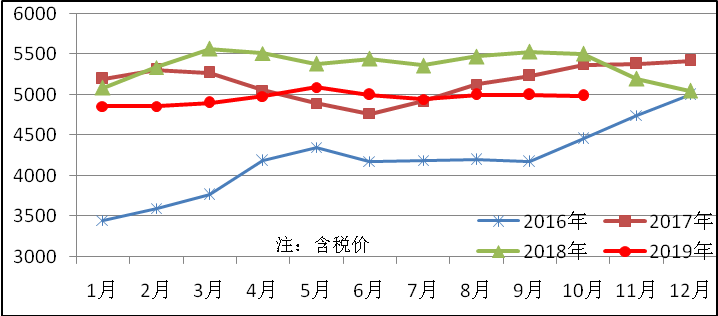 10月份生產鍍鋅板149萬噸,同比減少11萬噸,下降6.8%;本月銷售148萬噸,其中出口23萬噸,產銷率99.3%;售價4985元/噸,比上月下跌13元/噸;月末庫存35萬噸,比上月增加1萬噸。鍍鋅板平均價格見圖8。