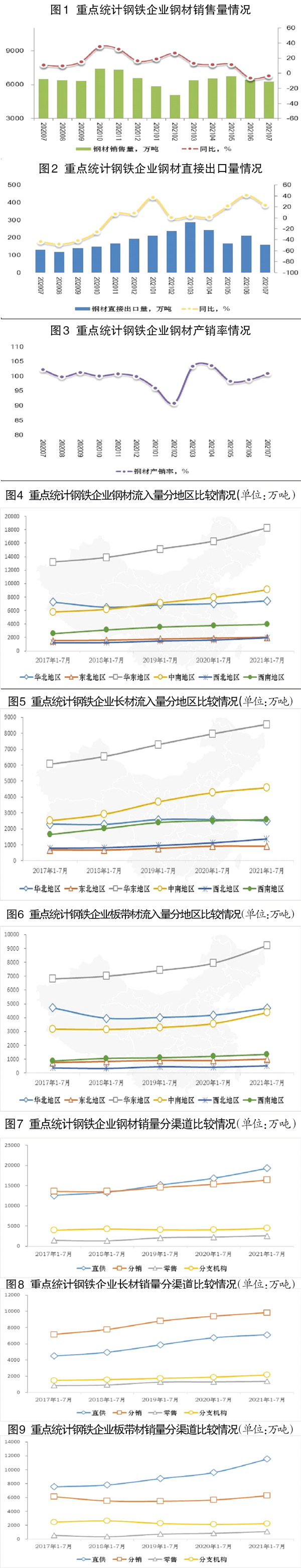 1月~7月份,重點統計鋼鐵企業鋼材直供銷量占鋼材國內銷售量的比例為45.17%,同2020年1月~7月份相比,鋼材直供銷量上升14.57%;鋼材分銷銷量占鋼材國內銷售量的比例為38.40%,同2020年1月~7月份相比,鋼材分銷銷量上升6.76%;鋼材零售銷量占鋼材國內銷售量的比例為6.04%,同2020年1月~7月份相比,鋼材零售銷量上升14.22%;鋼材分支機構銷量占鋼材國內銷售量的比例為10.39%,同2020年1月~7月份相比,鋼材分支機構銷量上升8.93%。