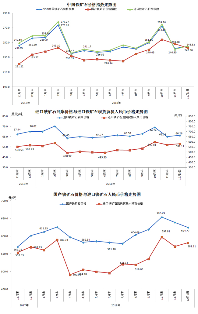 12月3日,中國鐵礦石價格指數(CIOPI)244.99點,環比上升3.06點,升幅為1.27%。其中:國產鐵礦石價格指數為242.80點,環比下降5.58點,降幅為2.25%;進口鐵礦石價格指數為245.32點,環比上升4.37點,升幅為1.81%。