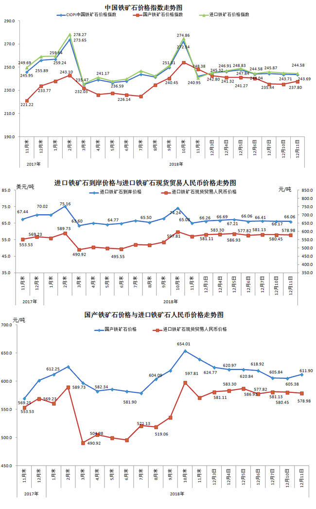 12月11日,中國鐵礦石價格指數(CIOPI)243.69點,環比下降0.02點,降幅為0.01%。其中:國產鐵礦石價格指數為237.80點,環比上升2.53點,升幅為1.08%;進口鐵礦石價格指數為244.58點,環比下降0.41點,降幅為0.17%。