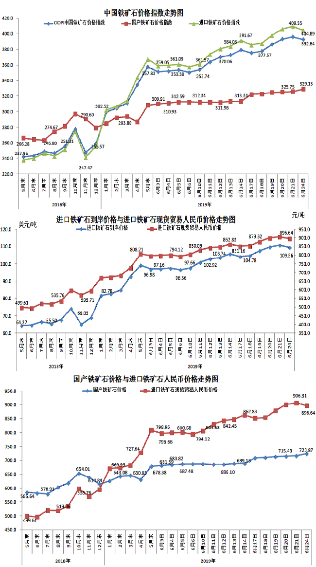6月24日,中國鐵礦石價格指數(CIOPI)392.84點,環比下降3.39點,降幅為0.85%。其中:國產鐵礦石價格指數為329.13點,環比上升3.38點,升幅為1.04%;進口鐵礦石價格指數為404.89點,環比下降4.66點,降幅為1.14%。