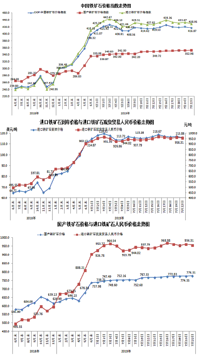 7月22日,中國鐵礦石價格指數(CIOPI)416.87點,環比下降3.66點,降幅為0.87%。其中:國產鐵礦石價格指數為352.98點,環比上升0.89點,升幅為0.25%;進口鐵礦石價格指數為428.95點,環比下降4.52點,降幅為1.04%。