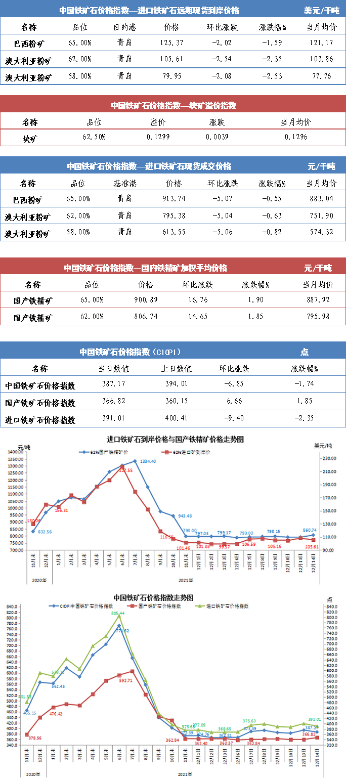 【行業指數】12月14日中國鐵礦石價格指數