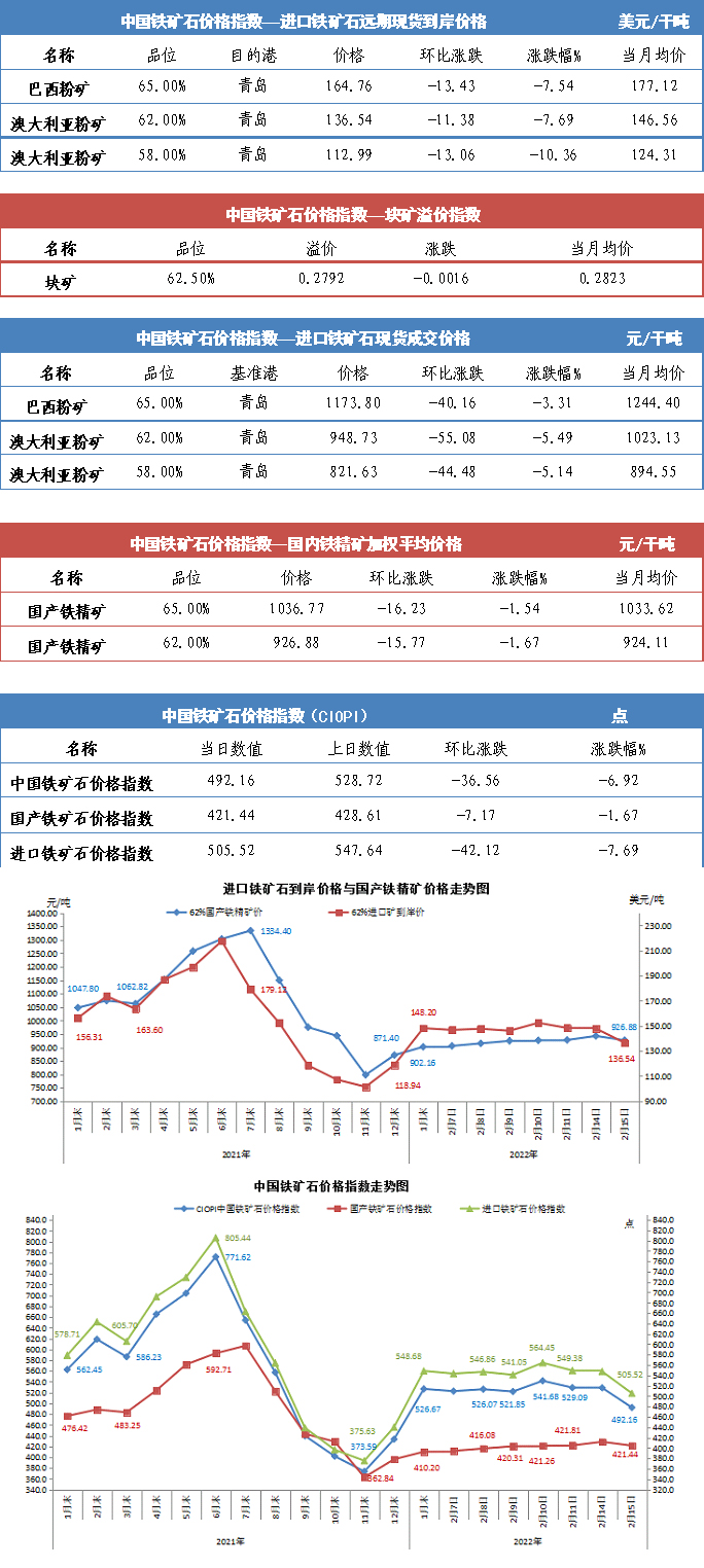 【行業指數】2月15日中國鐵礦石價格指數