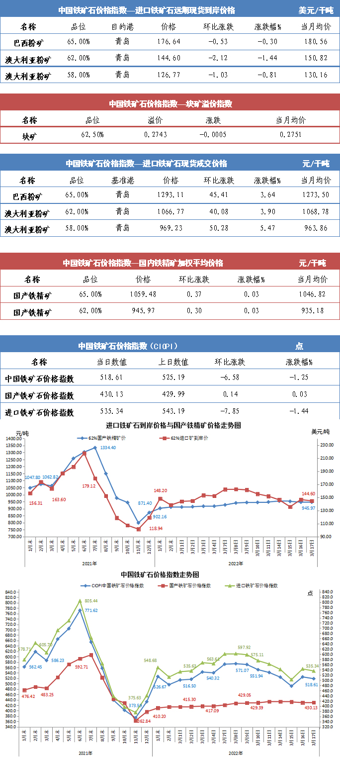 【行業指數】3月17日中國鐵礦石價格指數