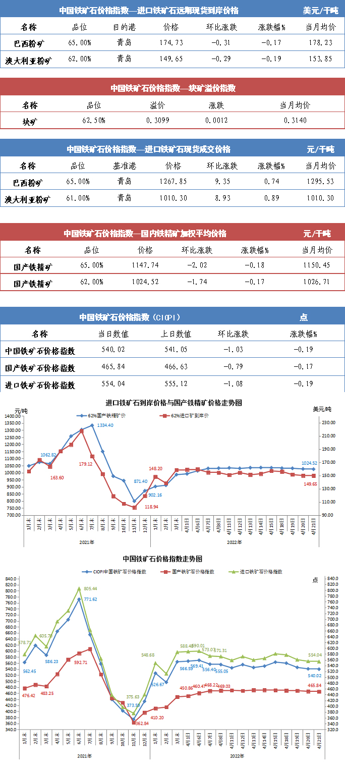 【行業指數】4月21日中國鐵礦石價格指數
