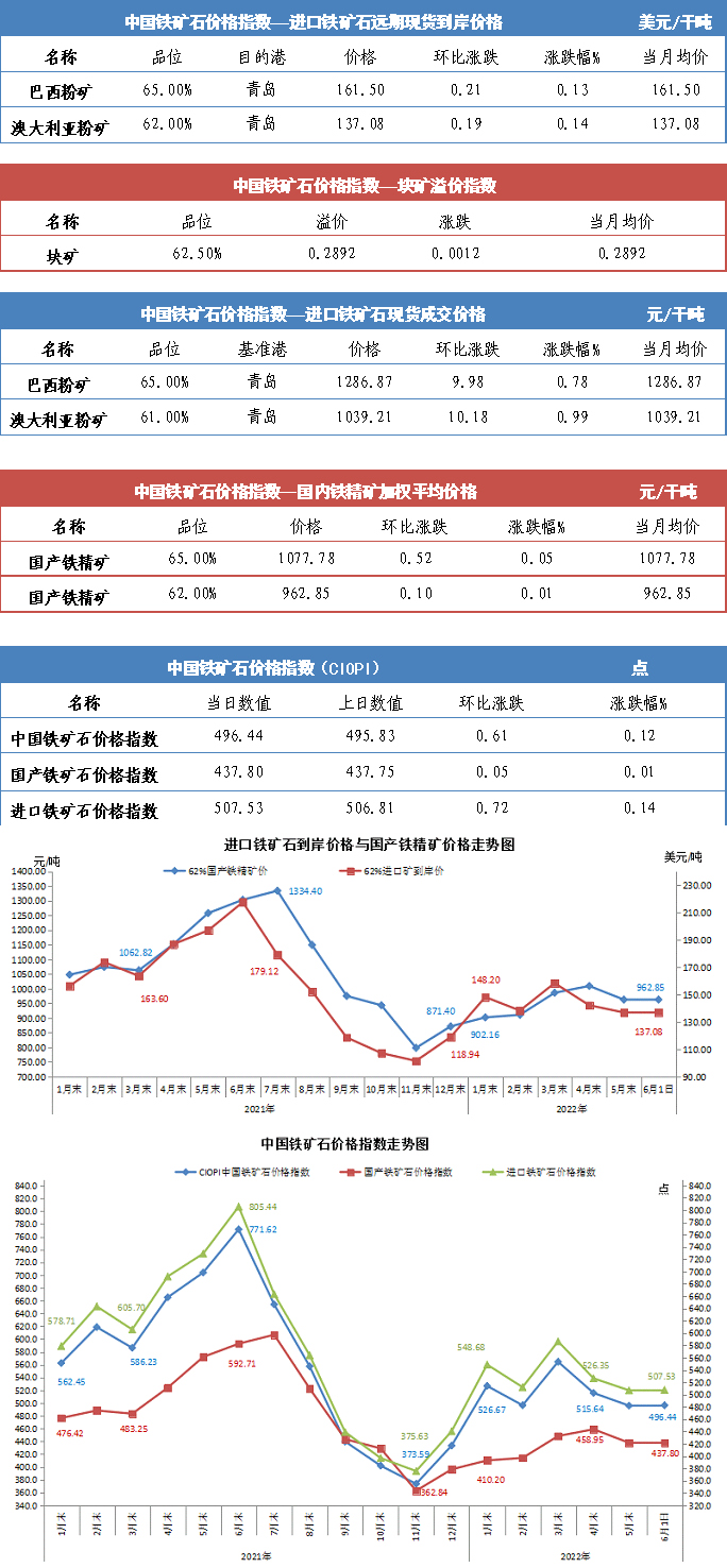 【行業指數】6月1日中國鐵礦石價格指數
