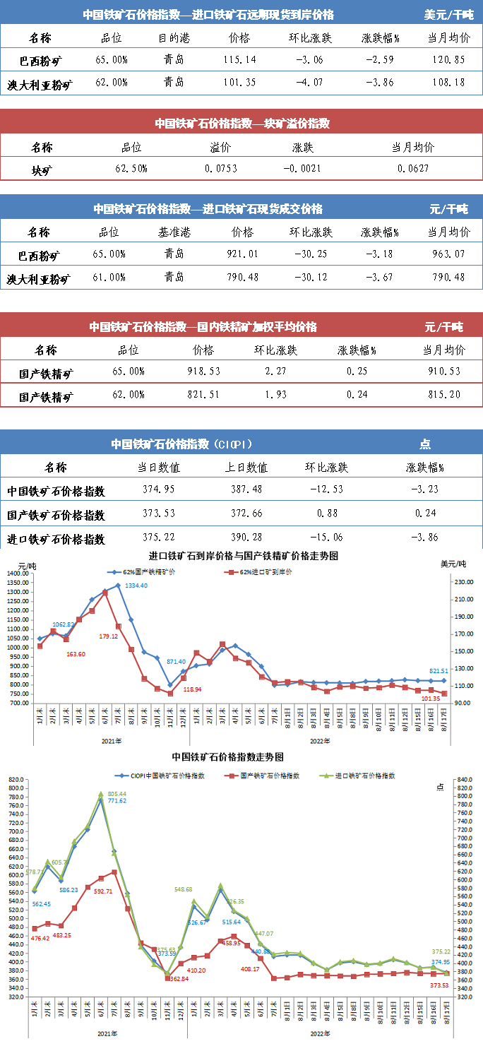 【行業指數】8月17日中國鐵礦石價格指數