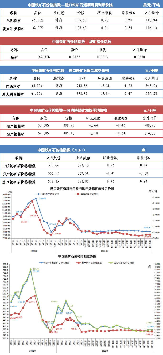【行業指數】8月24日中國鐵礦石價格指數