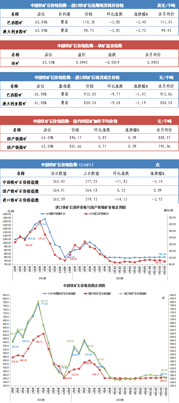 【行業指數】9月16日中國鐵礦石價格指數