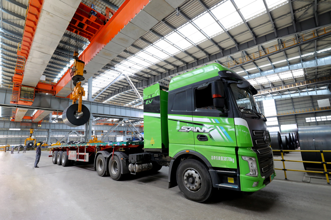 初夏時節,海風陣陣。湛藍的天空下,滿載河鋼唐鋼優質鋼材產品的嶄新純電動重型牽引車“靜悄悄”地發往周邊用戶。