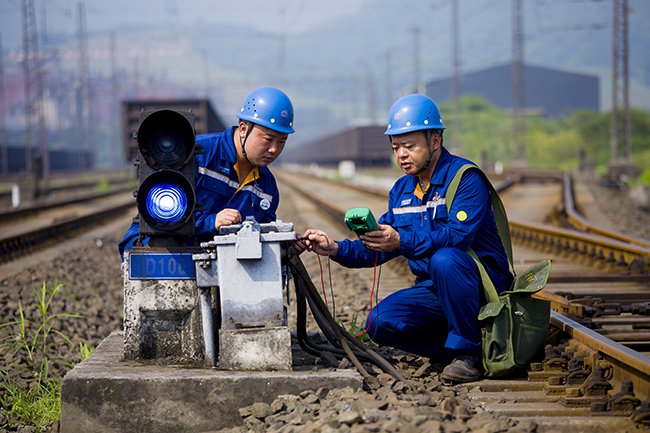7月12日,中國寶武重鋼鋼鐵物流運輸部裝卸設備作業區鐵路信號班點檢技師張高奎(右),正帶領他的技術團隊成員檢查鐵路信號機(如圖)。2022年上半年,張高奎帶領他的技術團隊在點檢級小改小革和創新設計方面,共計節約外委修理費和備品備件費達50多萬元。(朱軍 攝)