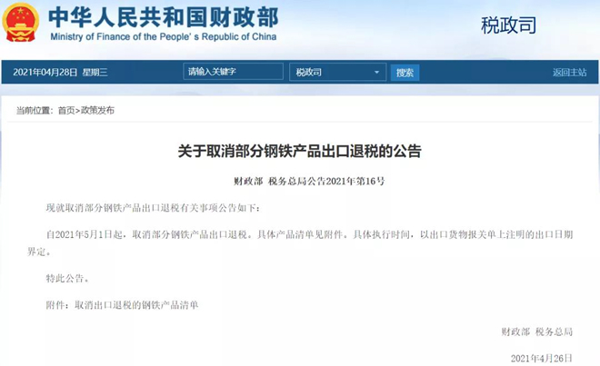 4月28日,財政部網站發布《關于取消部分鋼鐵產品出口退稅的公告》,自2021年5月1日起,取消部分鋼鐵產品出口退稅。其中,涉及146個鋼鐵產品的稅則號。