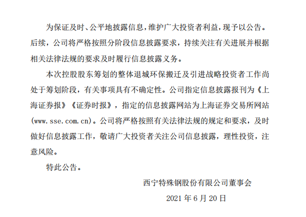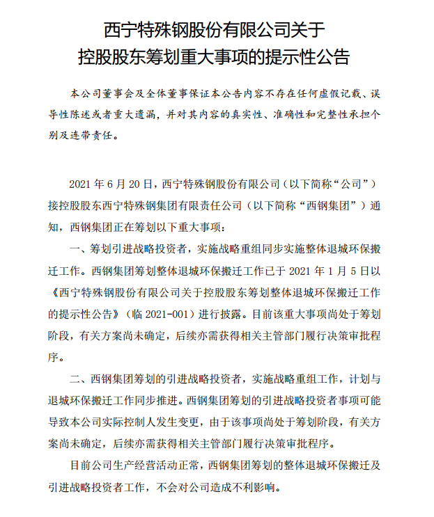 西寧特殊鋼股份有限公司關于控股股東籌劃重大事項的提示性公告