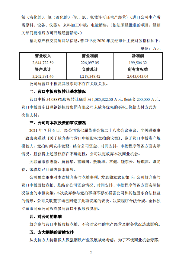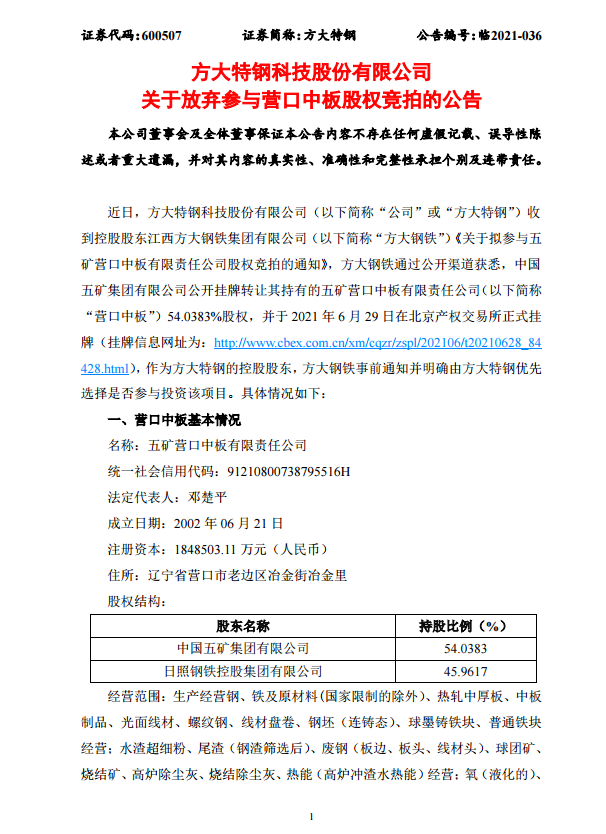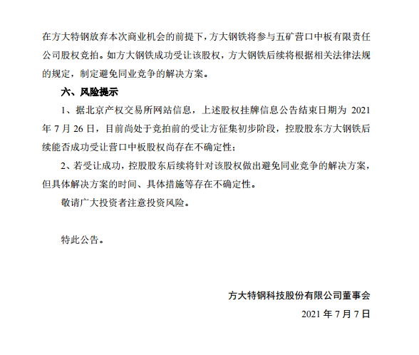 方大特鋼關于放棄參與營口中板股權競拍的公告