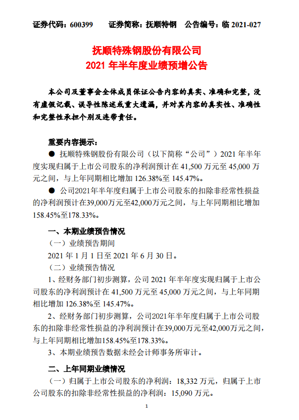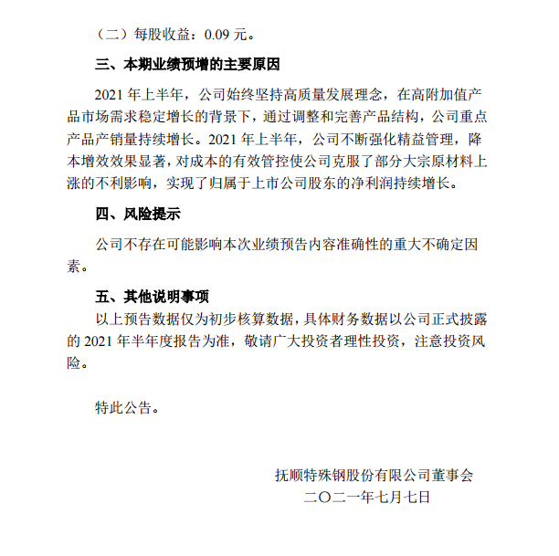 撫順特鋼:2021年半年度業績預增公告