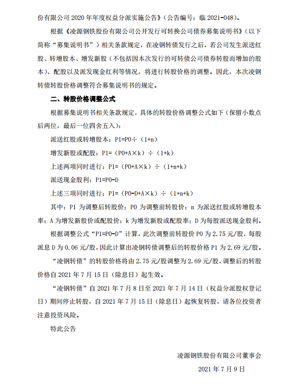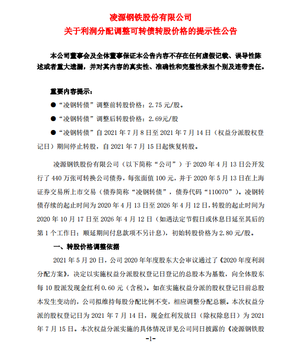 凌源鋼鐵股份有限公司關于利潤分配調整可轉債轉股價格的提示性公告