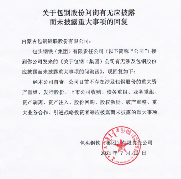 控股股東包鋼集團關于包鋼股份問詢有無應披露而未披露重大事項的回復