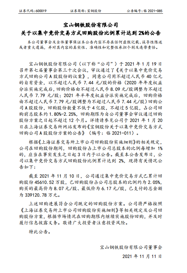 寶鋼股份關于以集中競價交易方式回購股份比例累計達到2%的公告