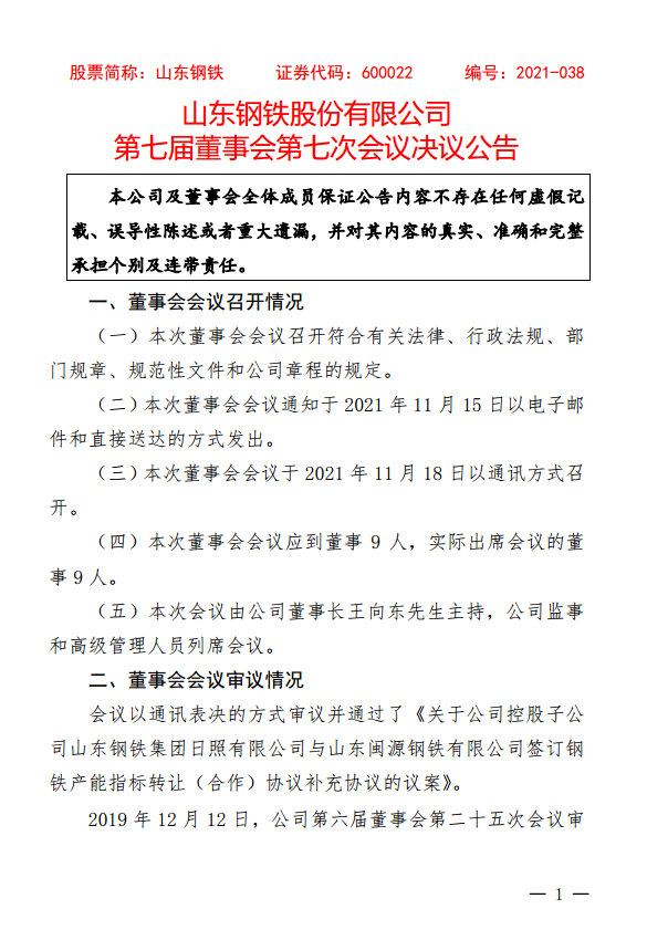 山東鋼鐵股份有限公司第七屆董事會第七次會議決議公告
