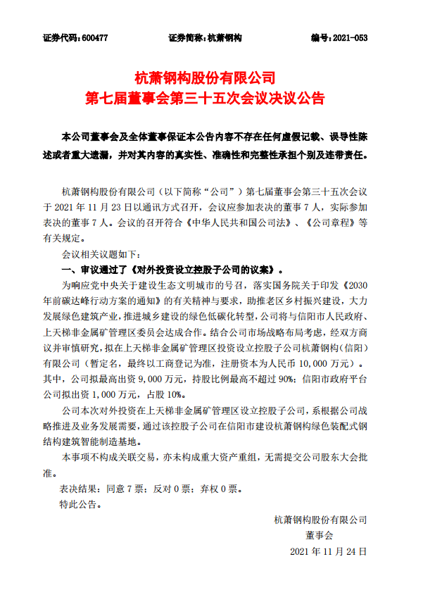 杭蕭鋼構第七屆董事會第三十五次會議決議公告