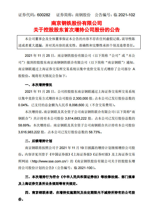 南京鋼鐵股份有限公司關于控股股東首次增持公司股份的公告