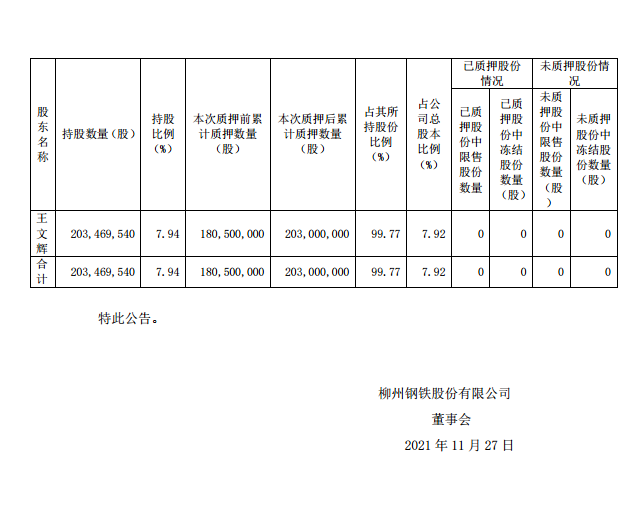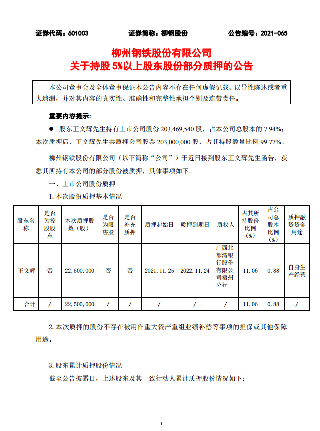 柳鋼股份關于持股5%以上股東股份部分質押的公告