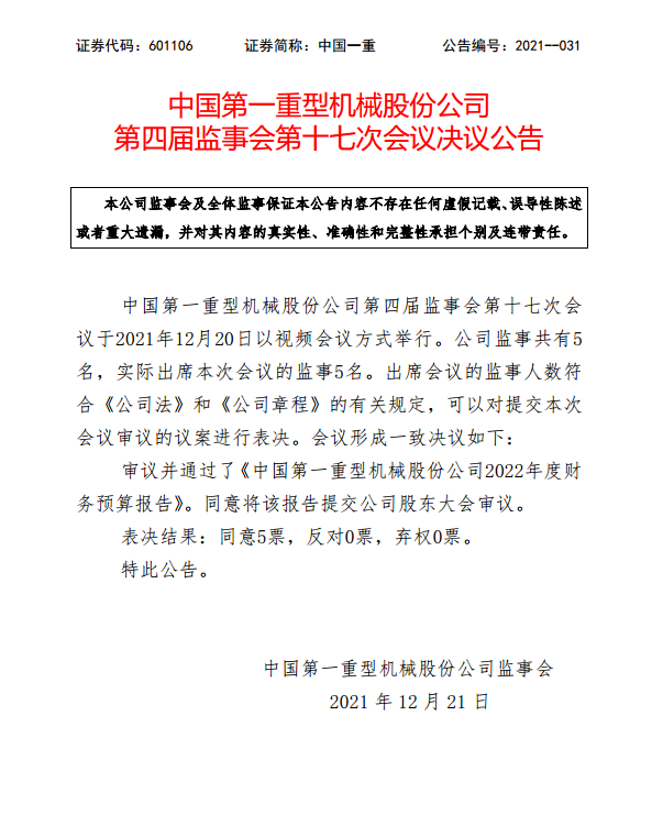 中國第一重型機械股份公司第四屆監事會第十七次會議決議公告