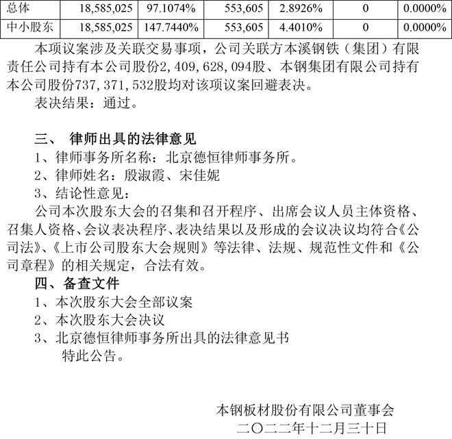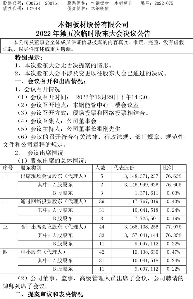 本鋼板材:本鋼板材股份有限公司2022年第五次臨時股東大會決議公告