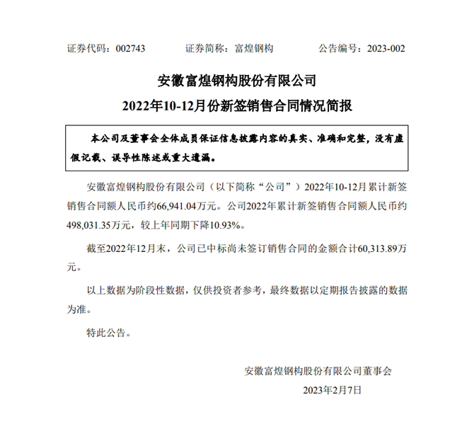 富煌鋼構:2022年10-12月份新簽銷售合同情況簡報