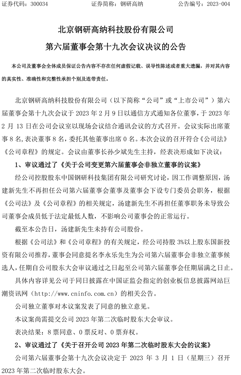 鋼研高納:第六屆董事會第十九次會議決議的公告