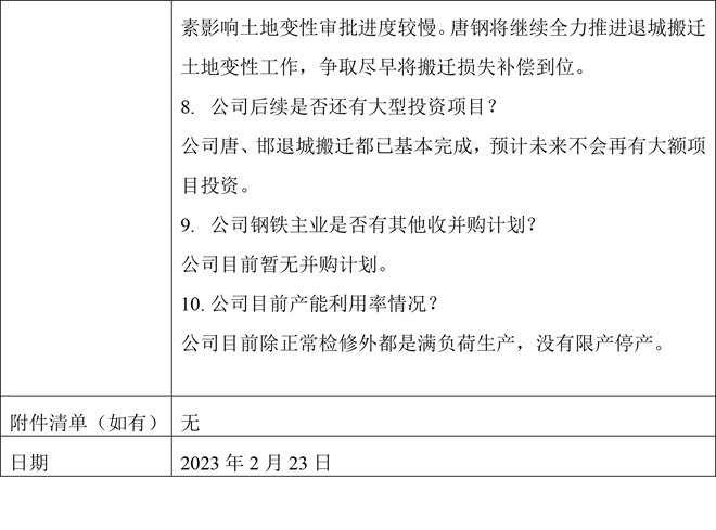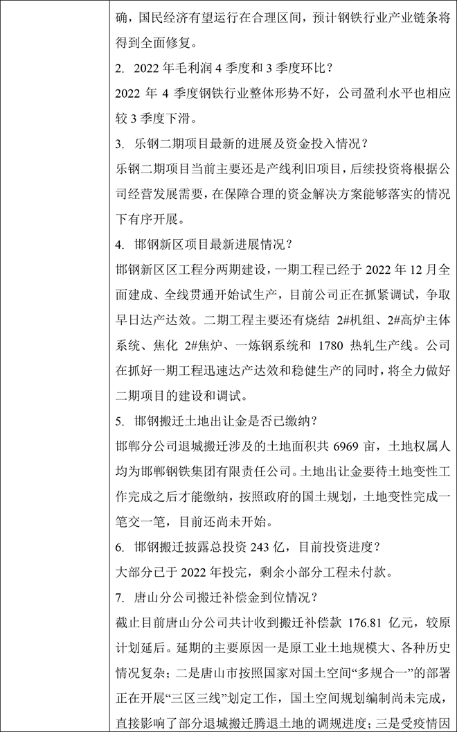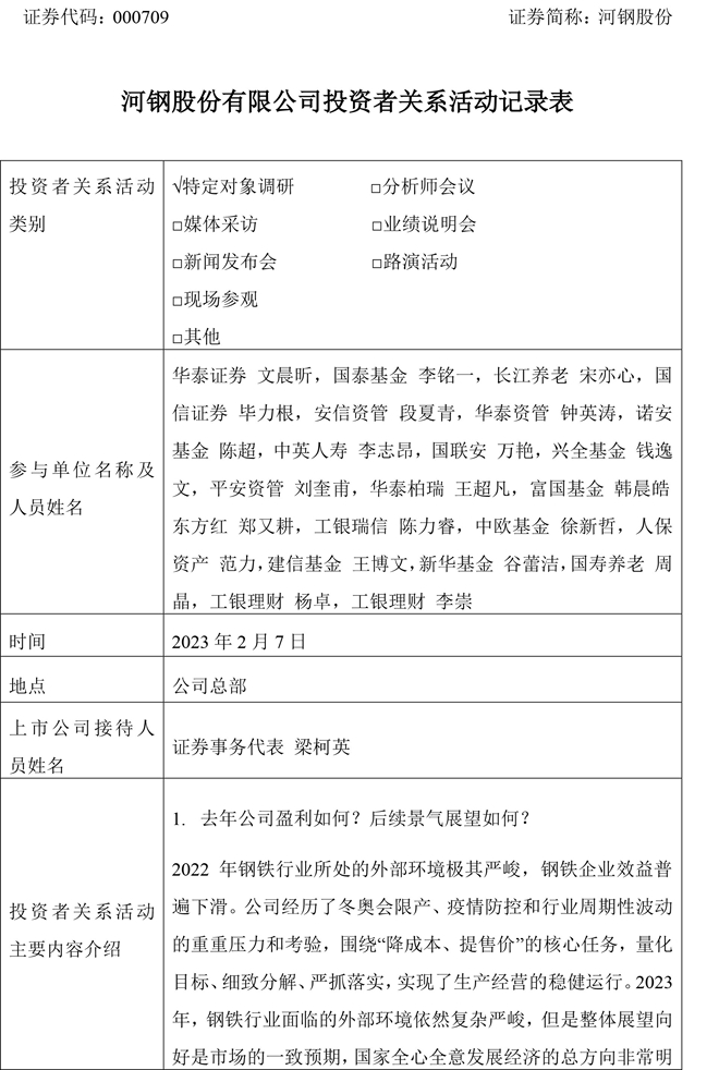 河鋼股份:000709河鋼股份調研活動信息20230223