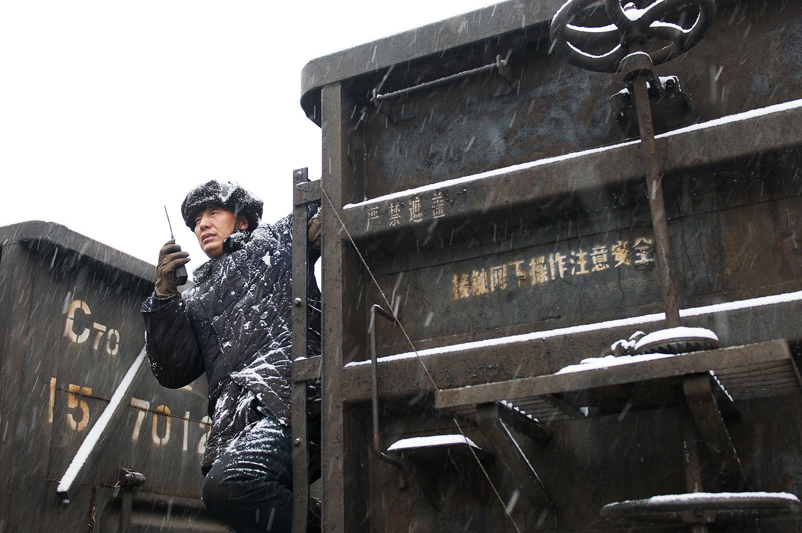 迎著風雪確保行車安全的安鋼運輸部調車員。(特約通訊員 殷海民 攝)