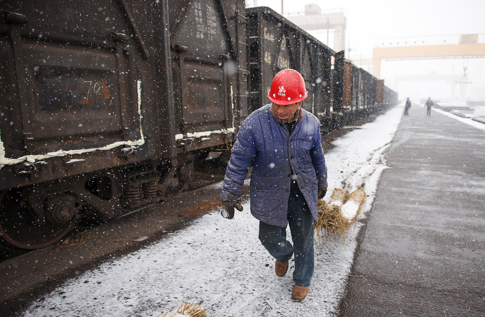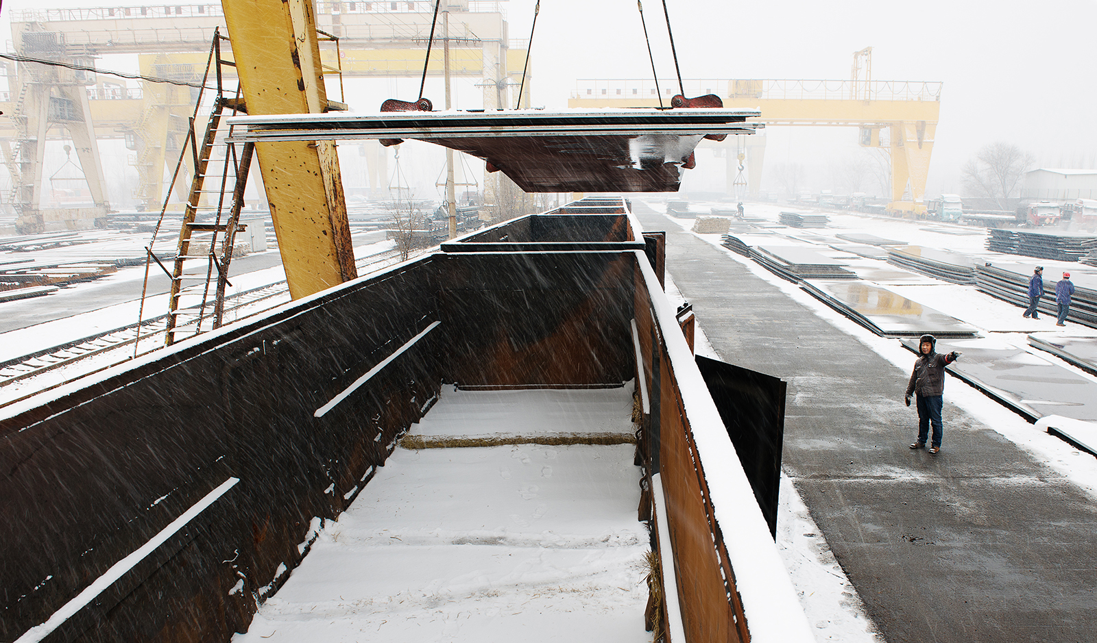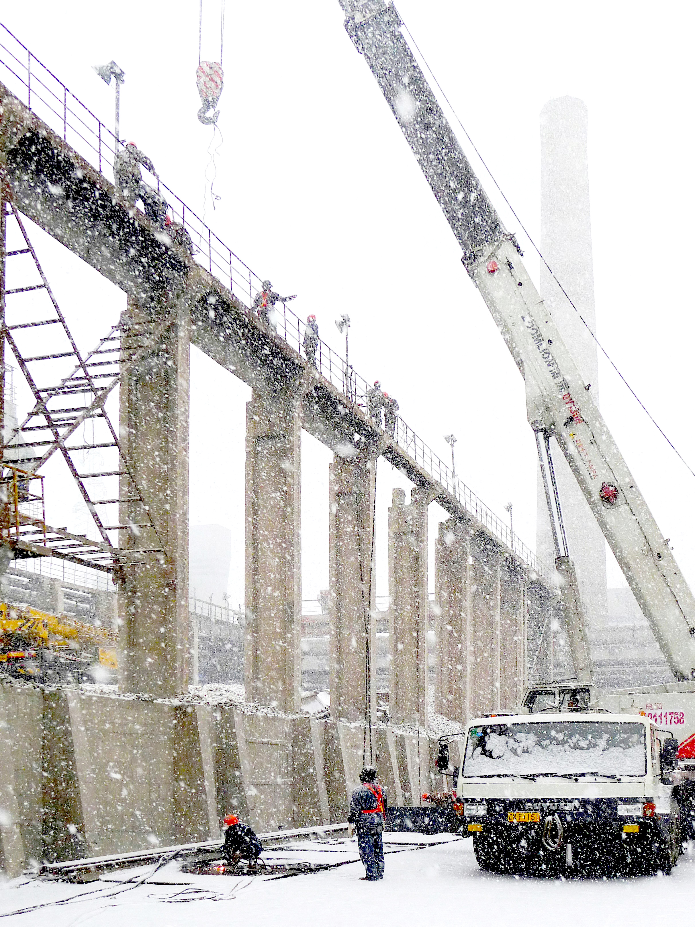 安鋼銷售總公司職工在風雪中吊裝發往西安的火車。(特約通訊員 殷海民 攝)