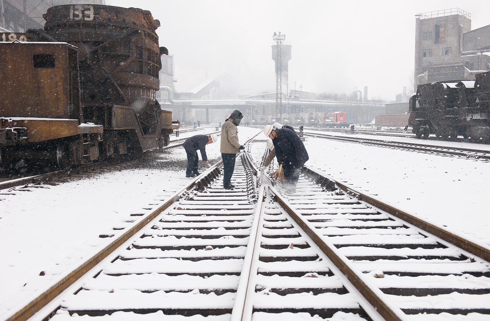 安鋼值班人員在清掃廠區鐵路道岔積雪。(特約通訊員 殷海民 攝)