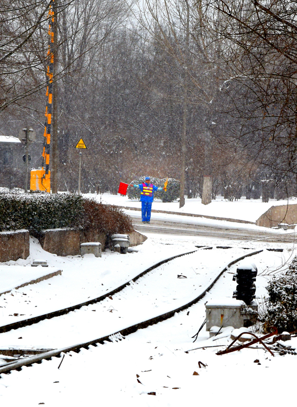 太鋼道口工在鐵道叉口冒雪工作。(特約通訊員 王旭宏 攝)