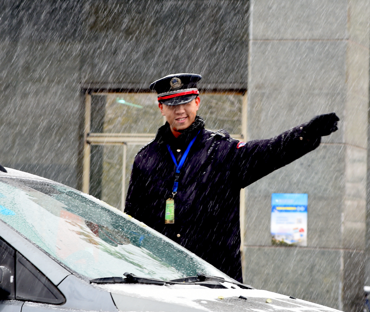 冒雪執勤的太鋼護衛人員依然保持著微笑。(特約通訊員 王旭宏 攝)