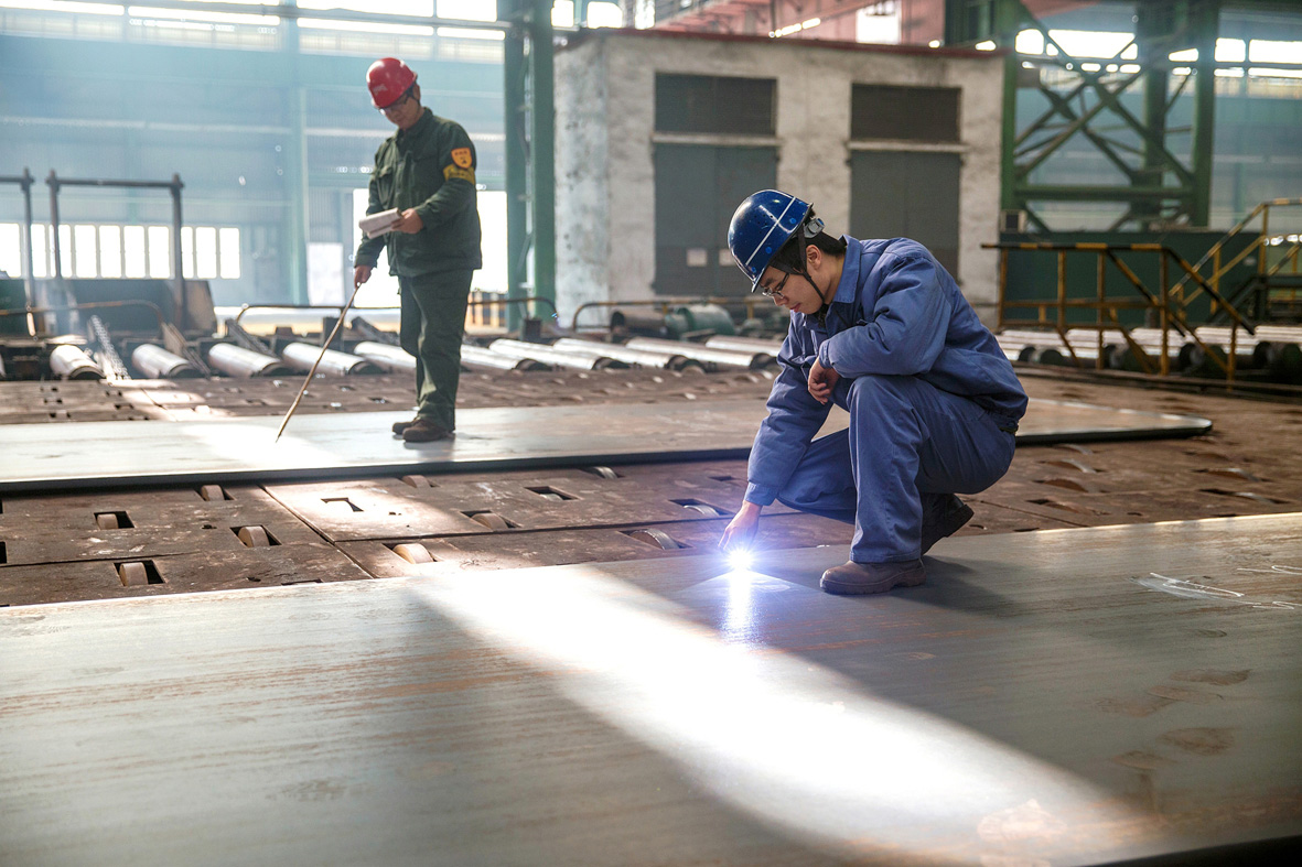 河鋼邯鋼中板廠扎實推進以產線為獨立市場單元的組織結構扁平化變革,大力應用新工藝、新技術,提高品種鋼生產水平。目前,品種鋼比例達到95%,產品結構進一步優化。圖為該廠職工正在檢查中板產品表面質量。(記者 吳兆軍 通訊員 劉兵 王其 攝)