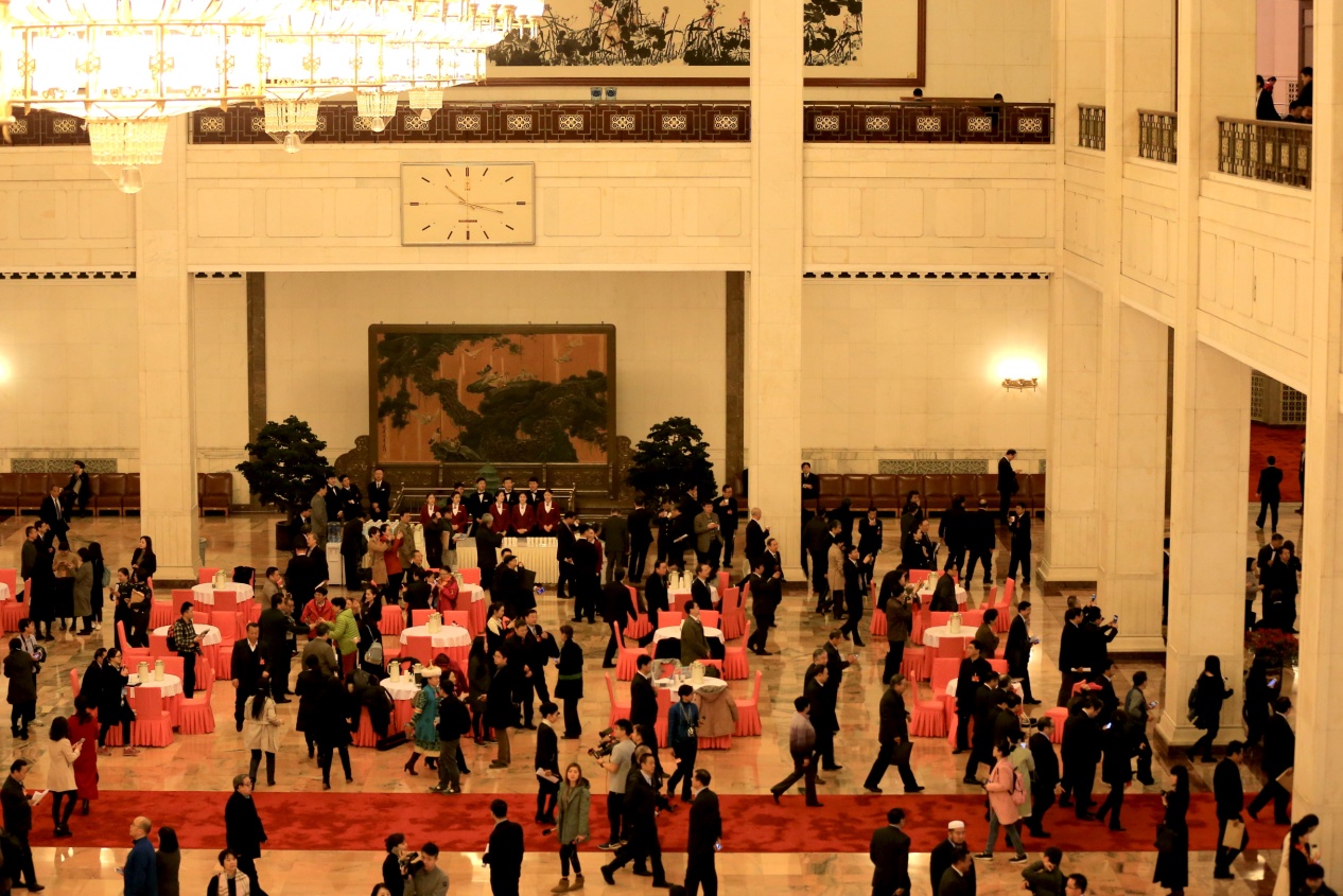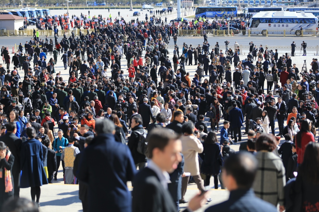 委員們步出人民大會堂,遠處的各駐地工作人員舉牌迎接。