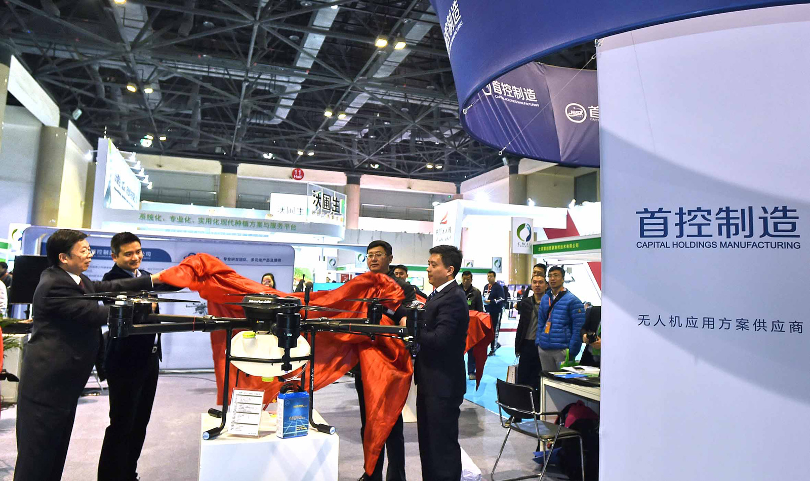 3月29日,首鋼控股公司江蘇制造技術公司自主研發設計的“山野”SS-1植保無人機,在第五屆中國(北京)國際智慧農業裝備與技術博覽會亮相。該產品于2017年3月正式投放市場,其最大亮點在于15公斤級載荷,大幅領先于國內普遍10公斤級載荷水平。圖為該產品在博覽會亮相瞬間。(特約通訊員 袁德祥 王京廣 攝)