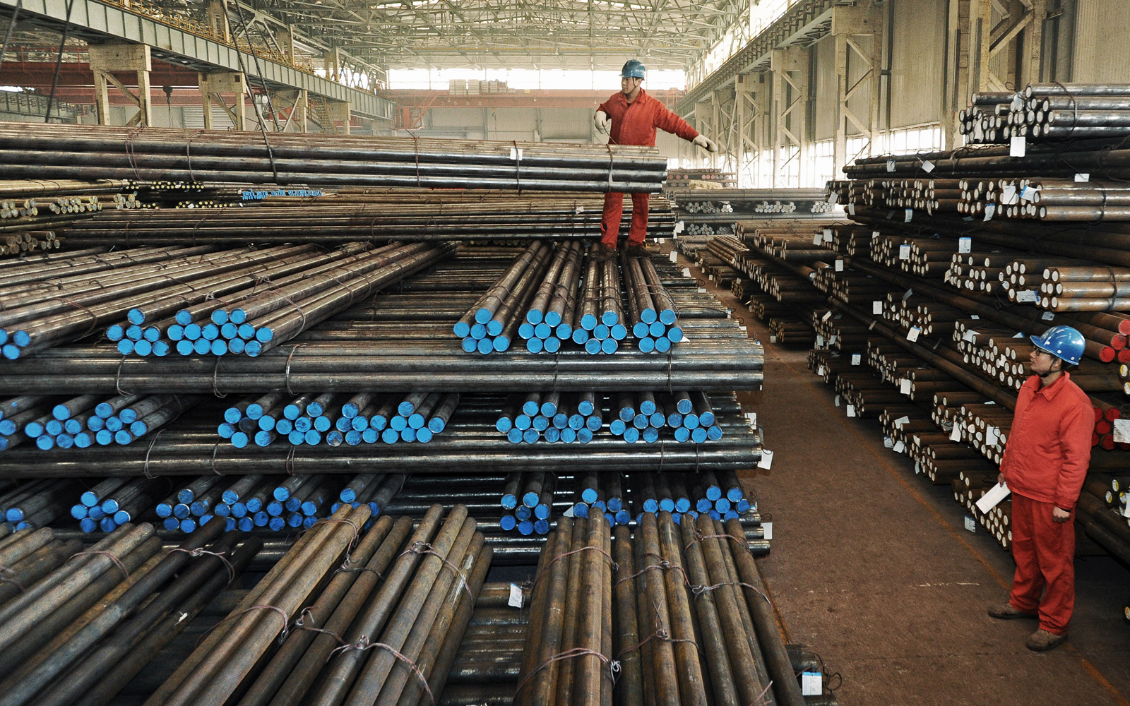 東北特鋼集團依法進入重整案以來,許多與該集團長期合作的國際大客戶,在詳細得知企業債務為非經營性債務后,一如既往開展業務往來活動,訂貨合同量不但沒有減少,反而呈現遞增態勢。2016年10月10日~2017年3月份,汽車發動機共軌系統用鋼、齒輪鋼、連桿用料以及高檔軸承鋼等訂貨產量同比增長218.83%。圖為該公司兩名員工在庫房擺放出口的汽車用鋼。(特約通訊員 劉德斌 攝)
