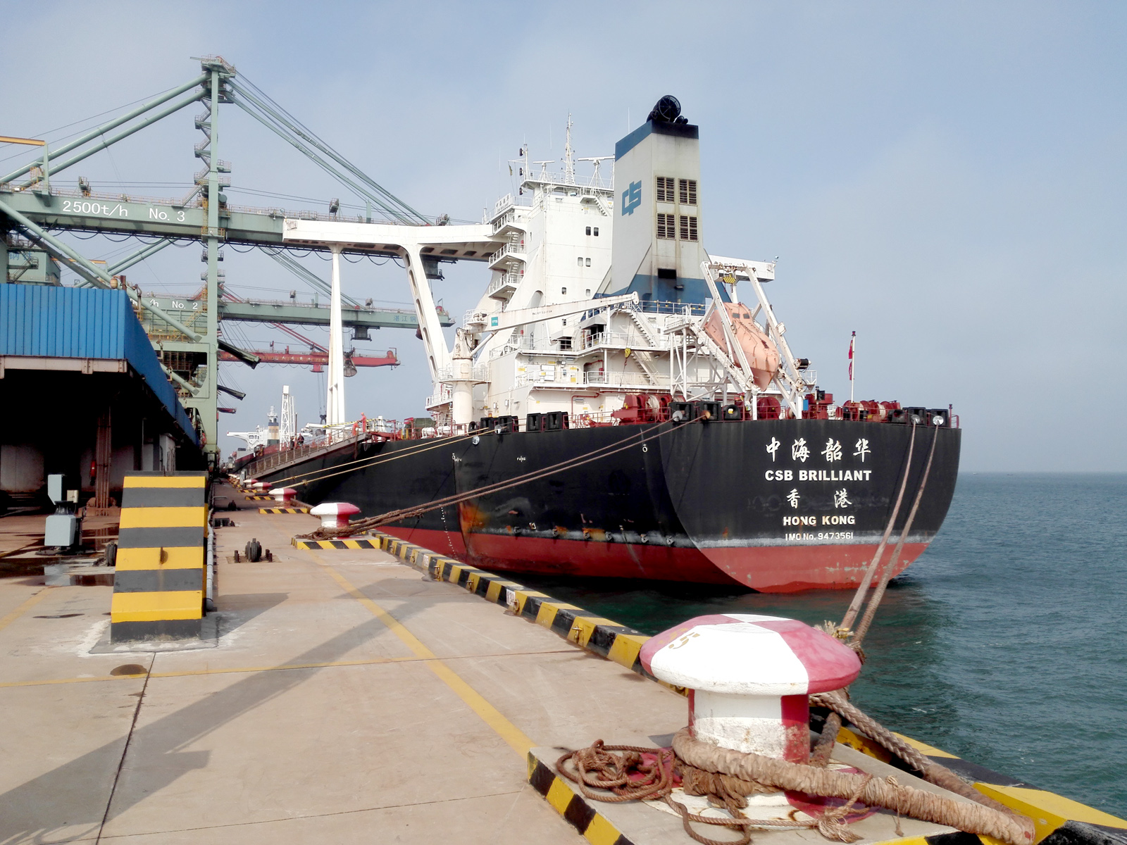 日前,裝載著31萬噸巴西鐵礦的“中海韶華”號散貨輪首次成功靠泊寶武集團湛江鋼鐵原料碼頭,并圓滿完成卸載任務。該散貨輪總排水量達到35.3萬噸,長330米,最大吃水22.25米,是湛江鋼鐵原料碼頭投產以來靠泊的吃水深度最深的輪船。圖為靠泊在碼頭的“中海韶華”號散貨輪。(羅耀華 攝)