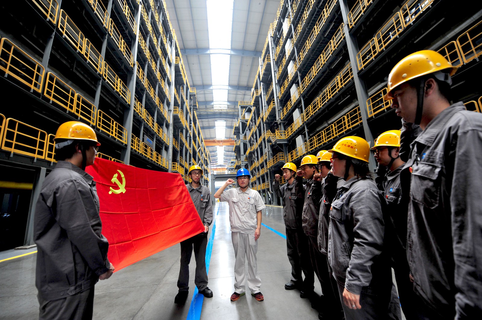 6月29日,中國寶武集團武鋼工程技術集團公司開展紀念中國共產黨建黨96周年活動,廣大黨員高唱國歌向黨的生日獻上祝福、表達忠心,為企業發展再增干勁。圖為該公司一批新黨員向黨旗立下錚錚誓言。(記者 朱旺春 攝)
