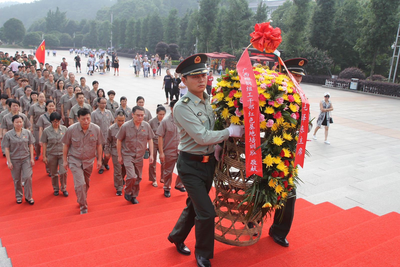 七一前夕,柳鋼在湖南韶山舉辦了以“提高黨性修養、落實從嚴治黨”為主題的組工干部紅色基地培訓班。圖為參加培訓的柳鋼組工干部向毛主席銅像敬獻花籃。(記者 覃守超 通訊員 覃智 攝)