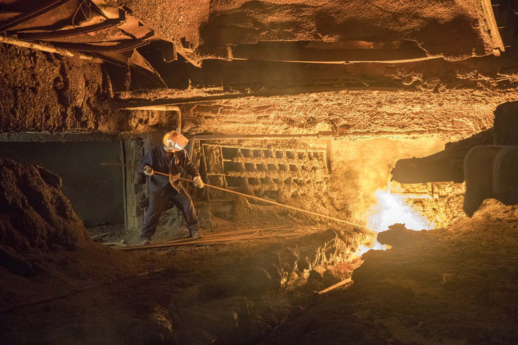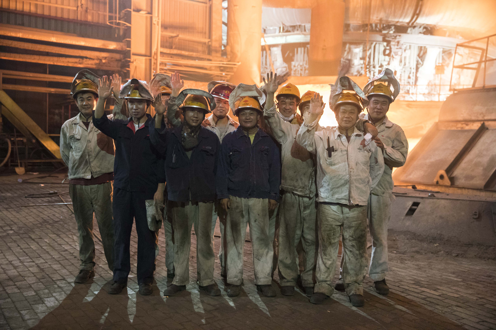 濟鋼3號1750立方米高爐即將流完最后一爐鐵,爐前工看到記者離去揮手告別。